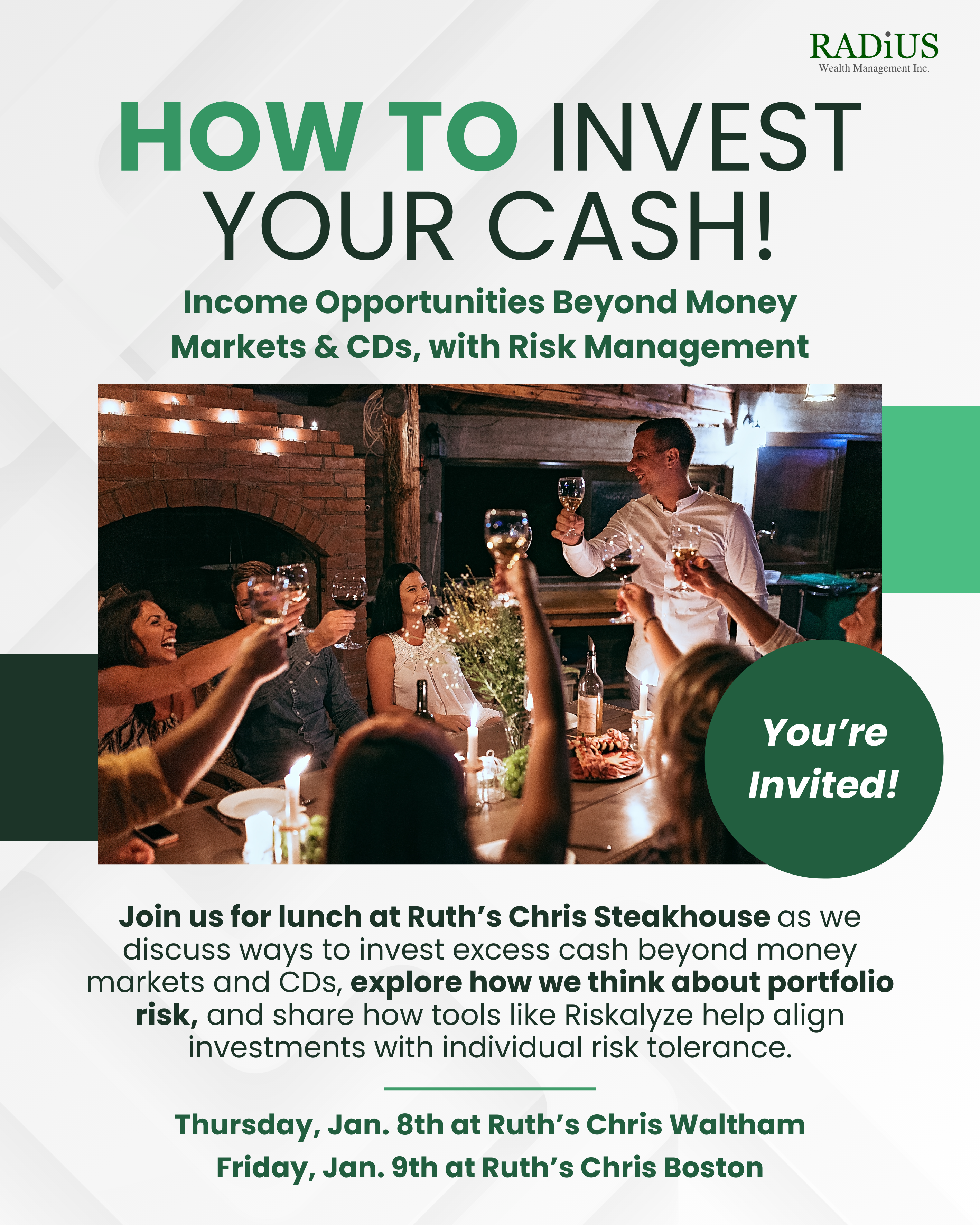Join us for lunch at Ruth’s Chris Steakhouse as we discuss ways to invest excess cash beyond money markets and CDs, explore how we think about portfolio risk, and share how tools like Riskalyze help align investments with individual risk tolerance. This session is designed to provide clear insights, encourage thoughtful discussion, and offer valuable perspectives on cash management and long-term planning. Feel free to bring a colleague or friend and join us for an engaging afternoon of conversation and ideas.